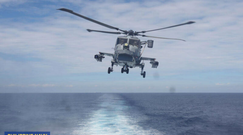 A People’s Liberation Army Z-9 utility helicopter made low-altitude monitoring flights Oct. 7, 2025, as the Philippine Coast Guard provided