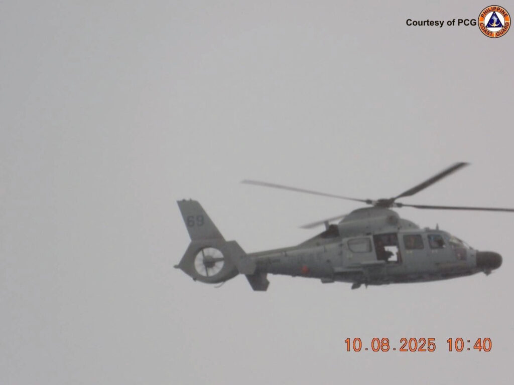 A People’s Liberation Army Z-9 utility helicopter made low-altitude monitoring flights Oct. 7, 2025, as the Philippine Coast Guard provided supplies to local fishermen near the Sabina Shoal. (Philippine Coast Guard photo)